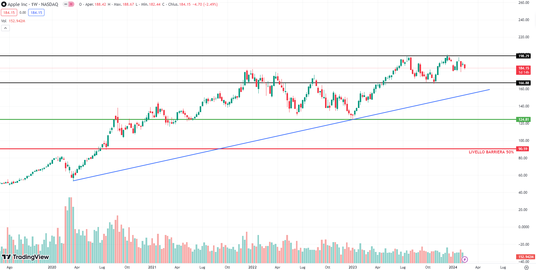 Per Apple non servono grandi presentazioni. Stiamo parlando di un colosso che capitalizza 2.900 miliardi di dollari in borsa. Nel 2023 l’azione è salita del 40%, ma gli acquisti sono proseguiti anche nelle prime settimane del 2024. Alla scrittura dei prezzi di fixing Apple quotava 181,18 dollari. Ora l’azione naviga a 187 dollari, pertanto alcuni punti percentuali sopra strike. La barriera è posizionata al 50%, poco sopra i 90 dollari, su valori decisamente ampi, che non vengono toccati dal titolo dall’ormai lontano 2020, anno del Covid.