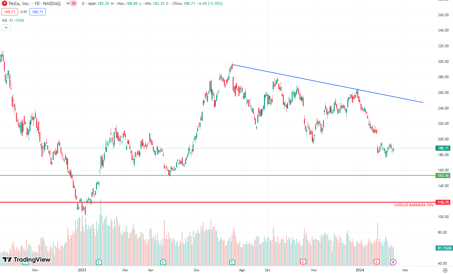Vale la pena iniziare l’analisi da Tesla, unico dei tre titoli a trovarsi sotto lo strike iniziale. L’azione naviga in area 190 dollari e permette al certificato di negoziare sotto la pari.
