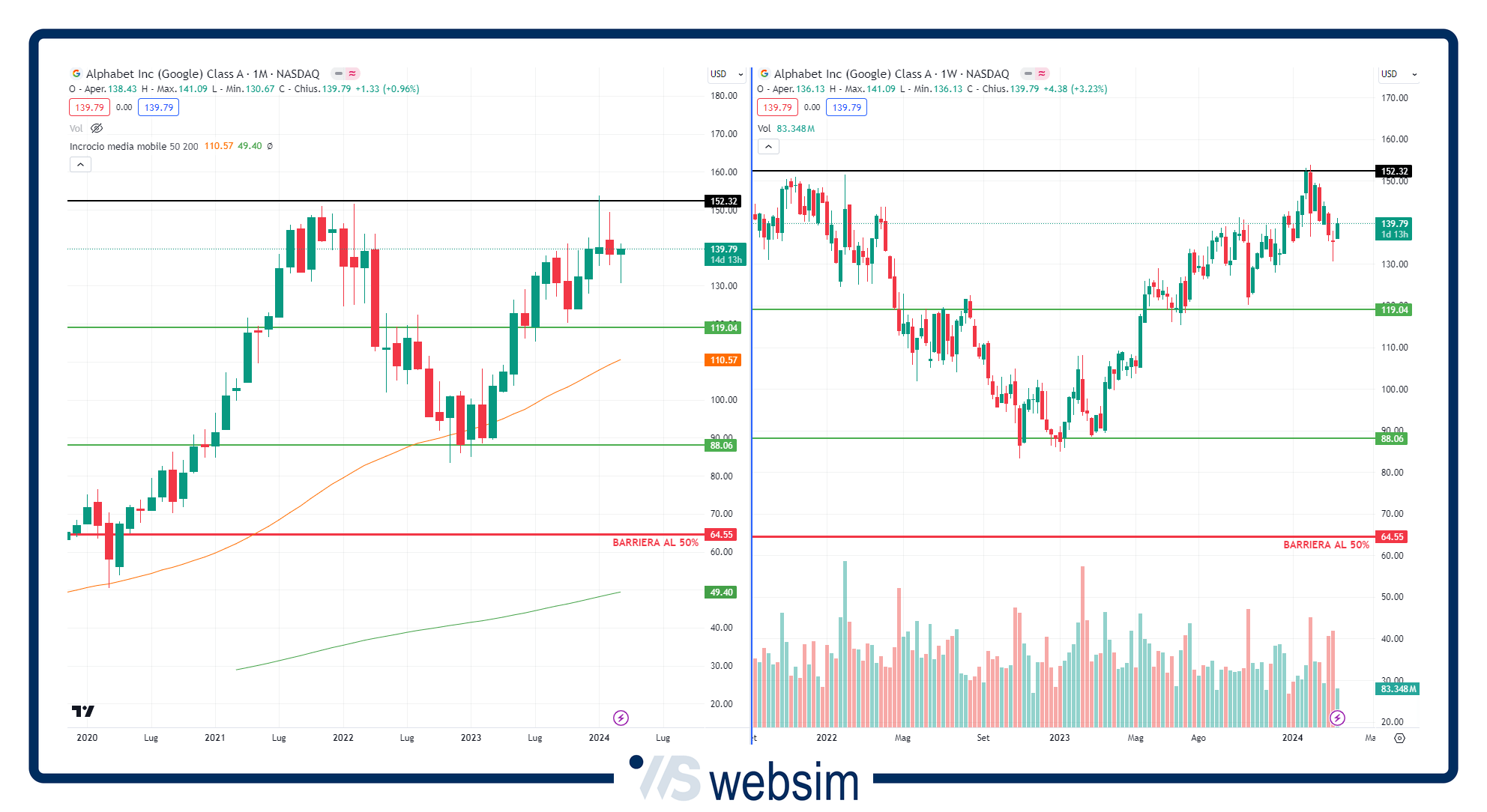 Qui sotto possiamo vedere l'andamento grafico degli altri due titoli del paniere e come vediamo sia Amazon che Alphabet si trovano molto distanti dalle rispettive barriere che risultano essere posizionate quindi su livelli strategici e al di sotto di importanti aree di supporto per i prezzi.