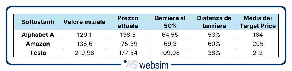 Emesso il 6 novembre 2023, questo certificate investe su un terzetto composto da Tesla, Amazon e Alphabet (classe A). La durata è tre anni. Il prodotto paga premi mensili con memoria dell’1,15%, che corrispondono a un rendimento annuo potenziale del 13,8%. I premi sono condizionati al rispetto di una barriera molto profonda, collocata al 50% del valore iniziale dei sottostanti (fixing).