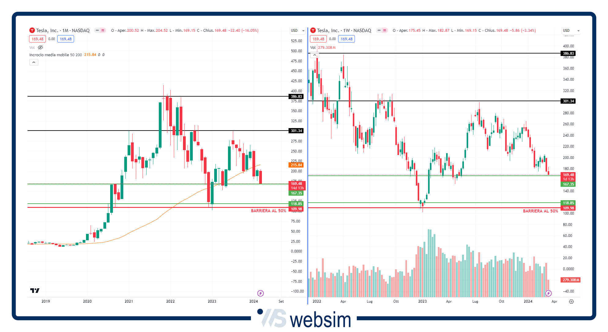 Nel grafico qui sotto possiamo vedere l'andamento su time frame mensile (a sinistra) e settimanale (a destra) di Tesla e come vediamo il colosso dell'EV, nonostante la recente fase di debolezza si trova ancora molto distante dalla barriera che si trova tra l'altro al di sotto di diverse ed importanti aree supportive (in primo luogo a 167$ e poi più in basso a quota 118$).