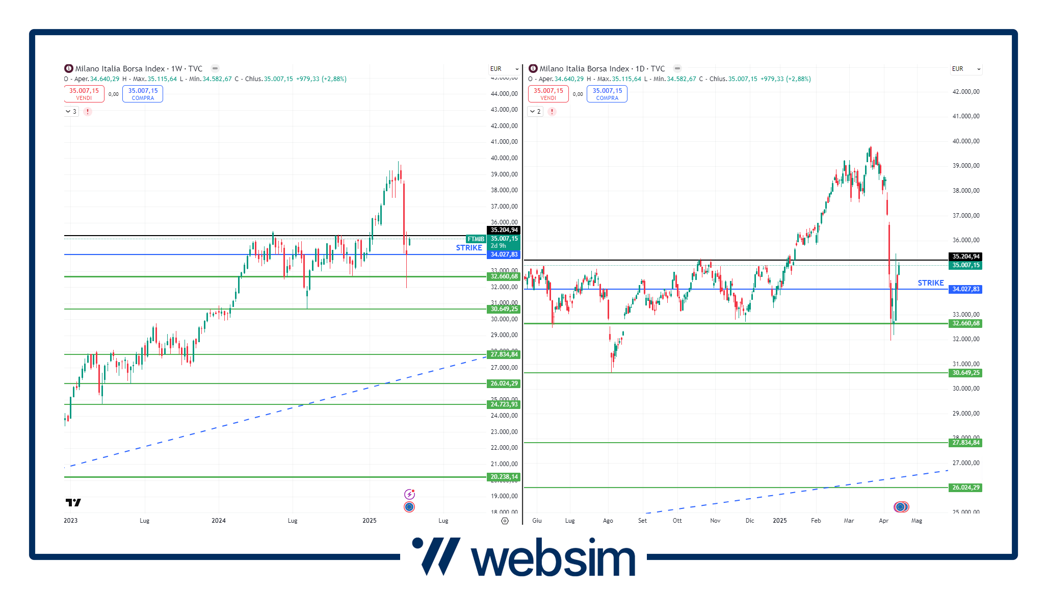 Come dicevamo, entrambi i nuovi certificati di Barclays hanno il vantaggio di aver fissato i loro prezzi di riferimento iniziali dopo il ritracciamento visto nelle prime settimane di aprile dopo l'annuncio dei dazi da parte di Trump. Per quanto riguarda il certificato ISIN XS2998159789, l'indice Ftse Mib ha fissato il suo prezzo strike a 34.027 punti, un livello che come vediamo dai grafici sotto è circa a metà altezza del trading range costruito lo scorso anno. Vista la recente volatilità e il rimbalzo delle ultime sedute, dal prezzo strike l'indice Ftse Mib si è già allontano del 2,7%.
