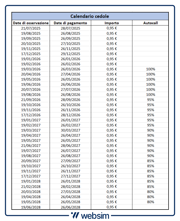 Di seguito vediamo il calendario dei premi e le date in cui sarà possibile il richiamo anticipato con i relativi trigger autocall level: