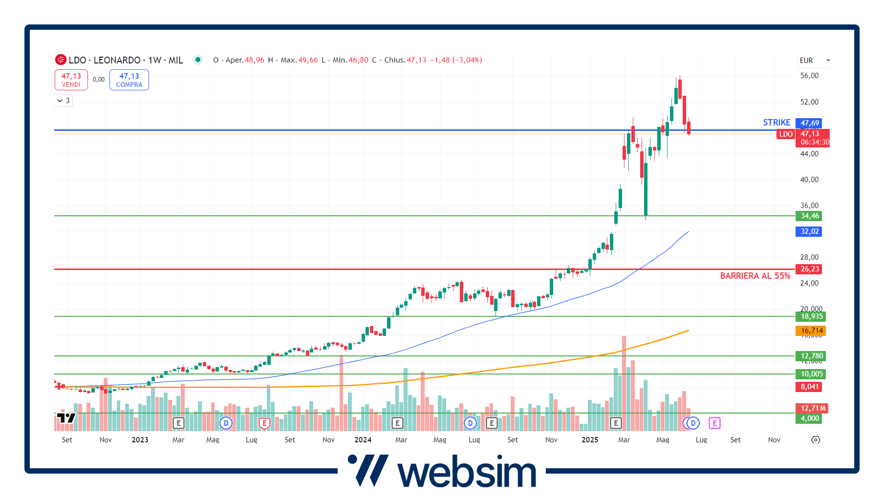 Nel certificato ISIN DE000VK6PWV5, Leonardo ha fissato il suo prezzo strike iniziale a quota 47,6 euro, con la sua barriera al 55% che, come vediamo dal grafico qui sotto, si va dunque a posizionare a 26,23 euro ad azione.