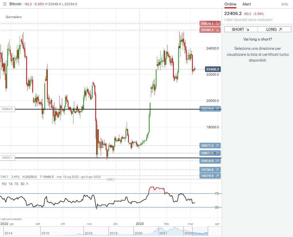 Operatività multiday: a questi prezzi, e soprattutto su eventuali spunti verso le resistenze in zona 24.000/25.000 usd, suggeriamo posizioni scalettate SHORT sul BITCOIN con Knock Out a 25.380,33 usd, fattore di leva 7x, con il certificato disponibile sulla piattaforma IG.