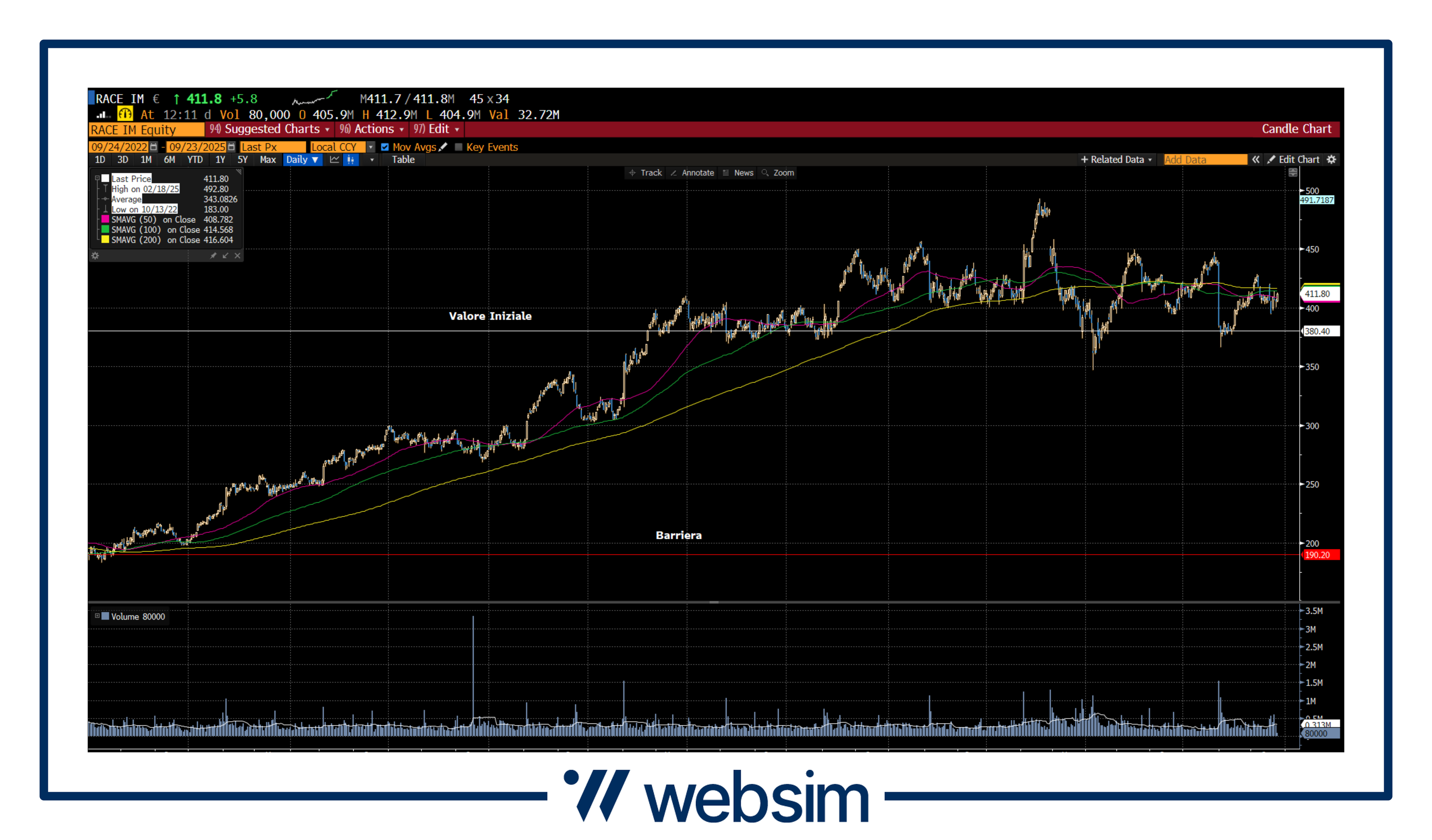 Ferrari quota attualmente in area 411,7 EUR, con un valore iniziale fissato a 380,4 EUR ed una barriera prevista a 190,2 EUR.