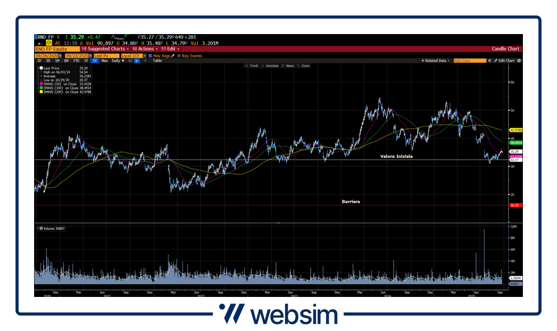 Renault quota attualmente in area 35,29 EUR, con un valore iniziale fissato a 32,37 EUR ed una barriera prevista a 16,19 EUR.