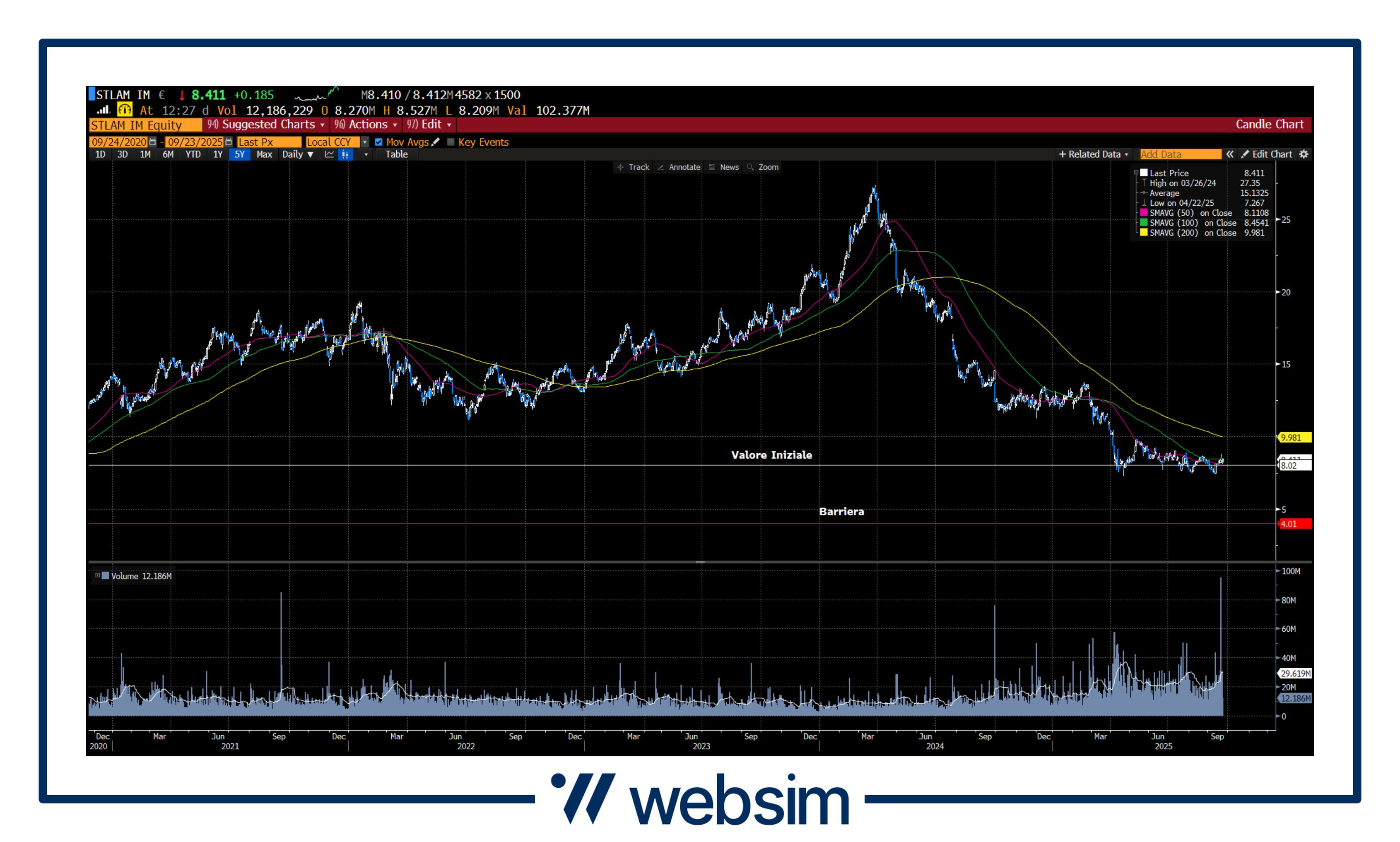 Stellantis quota attualmente in area 8,415 EUR, con un valore iniziale fissato a 8,02 EUR ed una barriera prevista a 4,01 EUR.