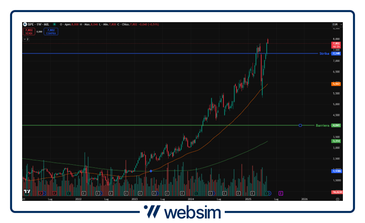 Anche BPER segue il trend rialzista del settore, iniziato lo scorso anno e che sta proseguendo nel corso di quest’ultimo. Performance solida e sostenuta come visto dai risultati del 1Q25, comunicati pochi giorni fa, registrati anch’essi al di sopra delle attese operative. In particolare si sottolineano ricavi totali maggiori del 5,40% rispetto alle aspettative, trainati da un forte contributo delle partecipazioni, un margine d’interesse resiliente e un ottimo andamento delle commissioni ed un buon controllo delle OpEx. Il titolo quota attualmente in area 7,82 euro, con lo strike fissato alle 7,348 euro e l’unica barriera prevista a 4,0414 euro.