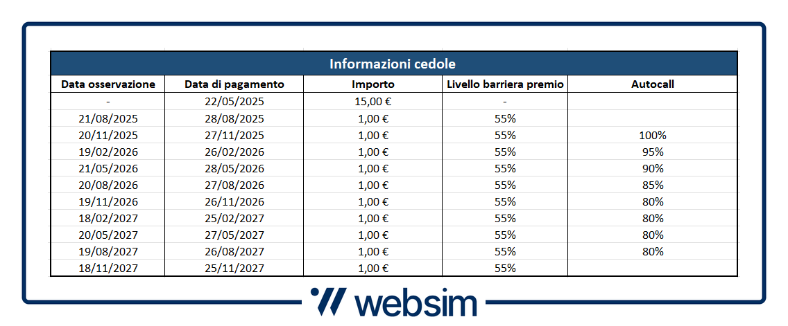Il certificato ha una durata prevista di due anni e mezzo circa, con possibilità di richiamo anticipato a partire da novembre 2025. Grazie al meccanismo di Autocall, infatti, da novembre 2025 in poi, se in una qualsiasi data di osservazione prevista tutti e tre i sottostanti risultano sopra i rispettivi livelli di richiamo anticipato previsti, il certificato sarà rimborsato anticipatamente, restituendo il valore nominale e includendo gli eventuali coupon rimasti in memoria.