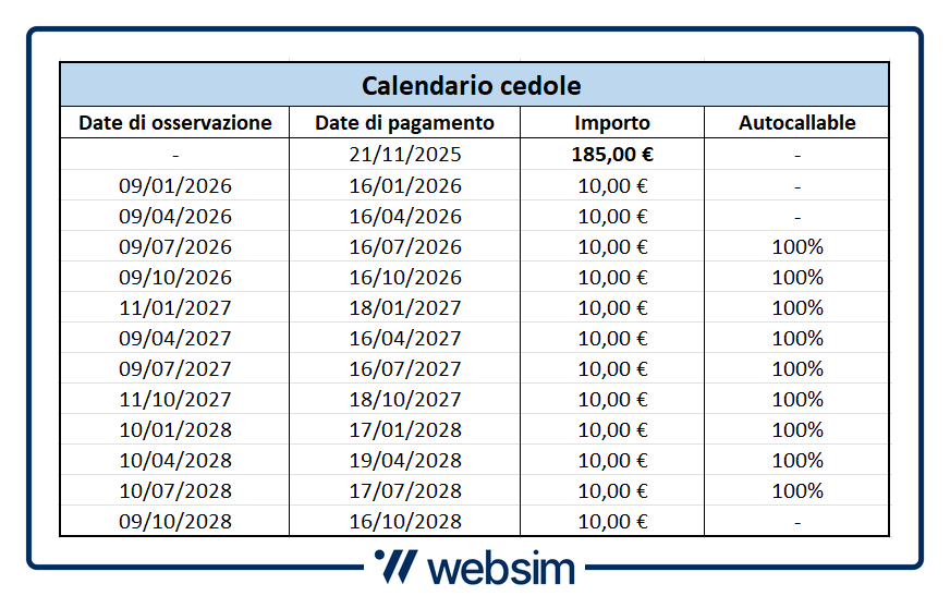 La maturity in questo caso sale a quattro anni con la scadenza che è prevista per l'ottobre 2029. Tuttavia, è possibile il richiamo anticipato con il meccanismo di autocall con trigger fisso al 100% che sarà attivo da luglio 2026.