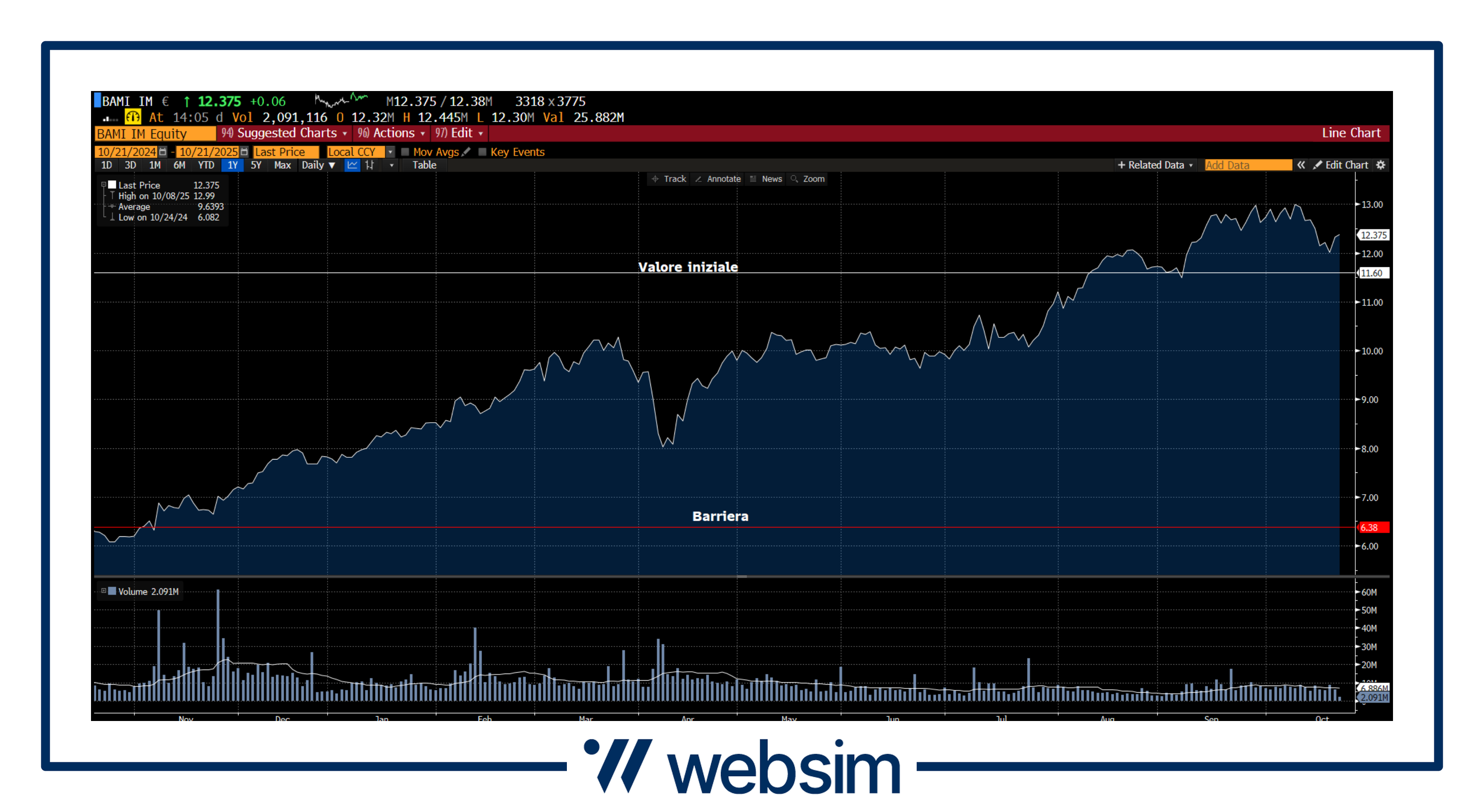Il titolo quota attualmente in area 12,375 EUR, con uno strike iniziale fissato a 11,6 EUR, una barriera coupon/capitale a 6,38 EUR