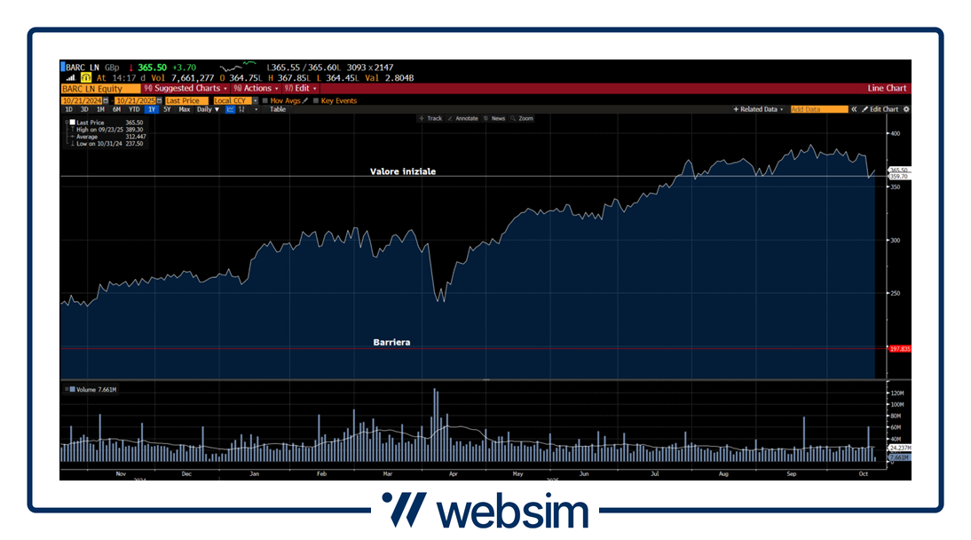 Il titolo quota attualmente in area 365,50 GBp con uno strike iniziale fissato a 359,7 GBp, una barriera coupon/capitale a 197,835 GBp.