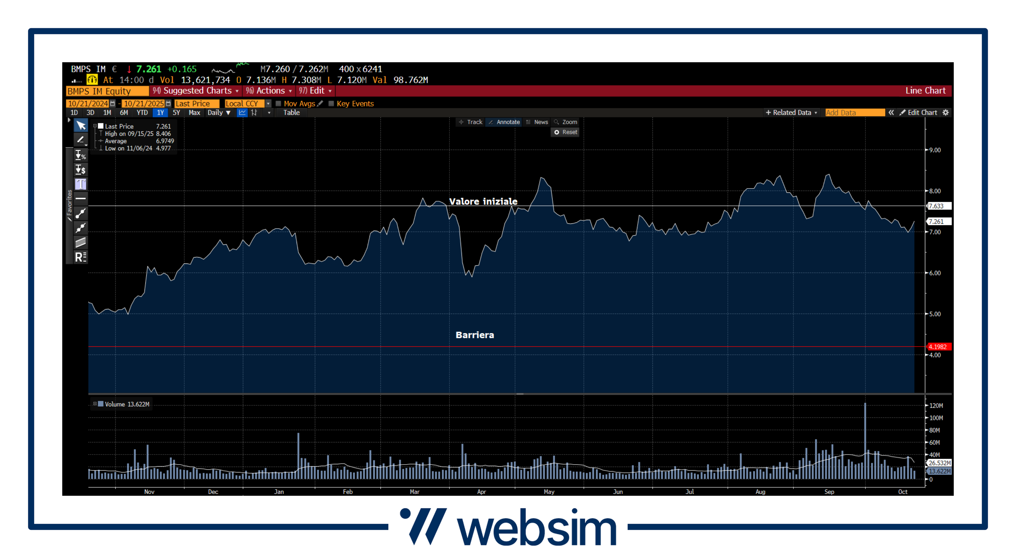 Il titolo quota attualmente in area 7,261 EUR, con uno strike iniziale fissato a 7,633 EUR, una barriera coupon/capitale a 4,1982 EUR