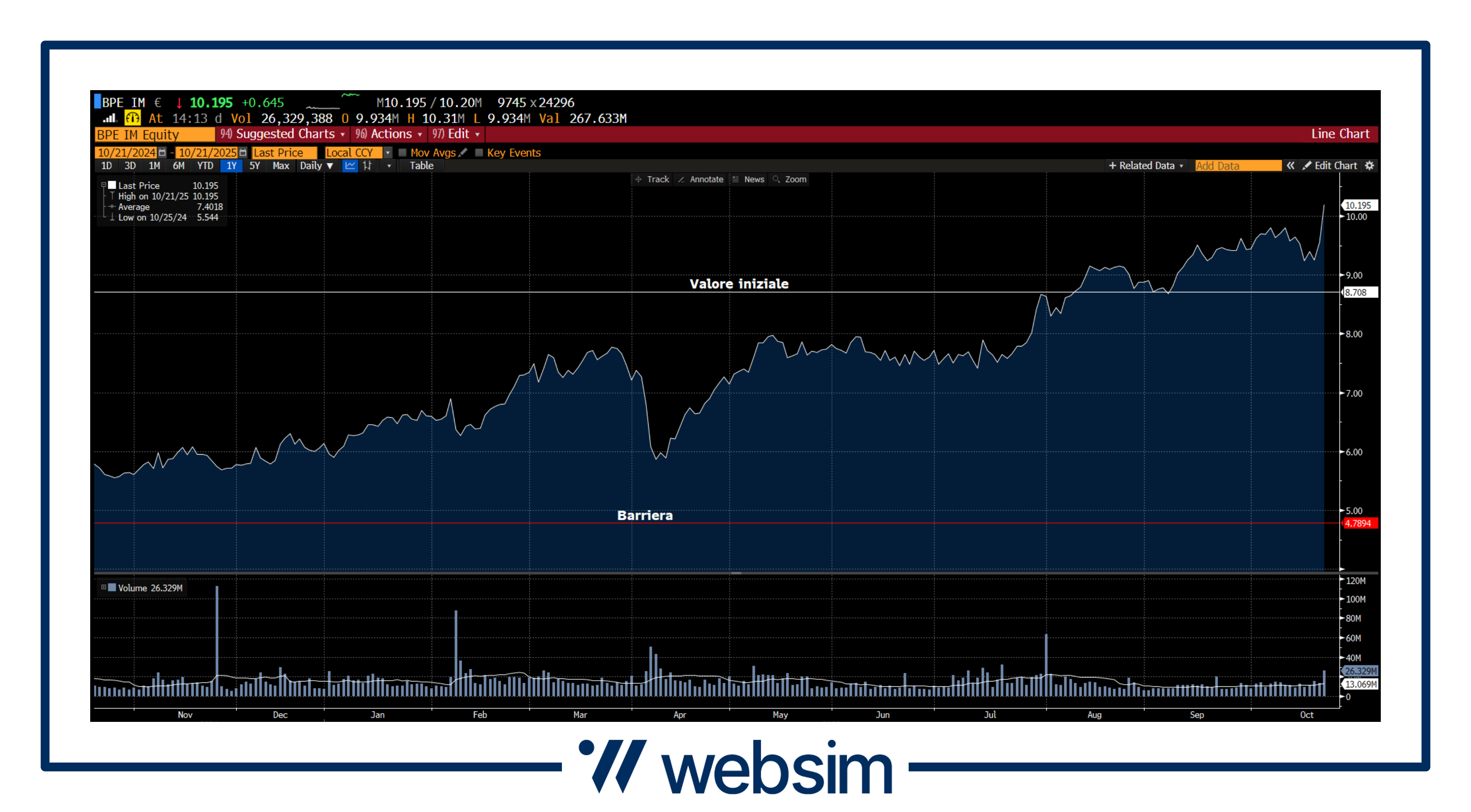 Il titolo quota attualmente in area 10,195 EUR, con uno strike iniziale fissato a 8,708 EUR, una barriera coupon/capitale a 4,7894 EUR