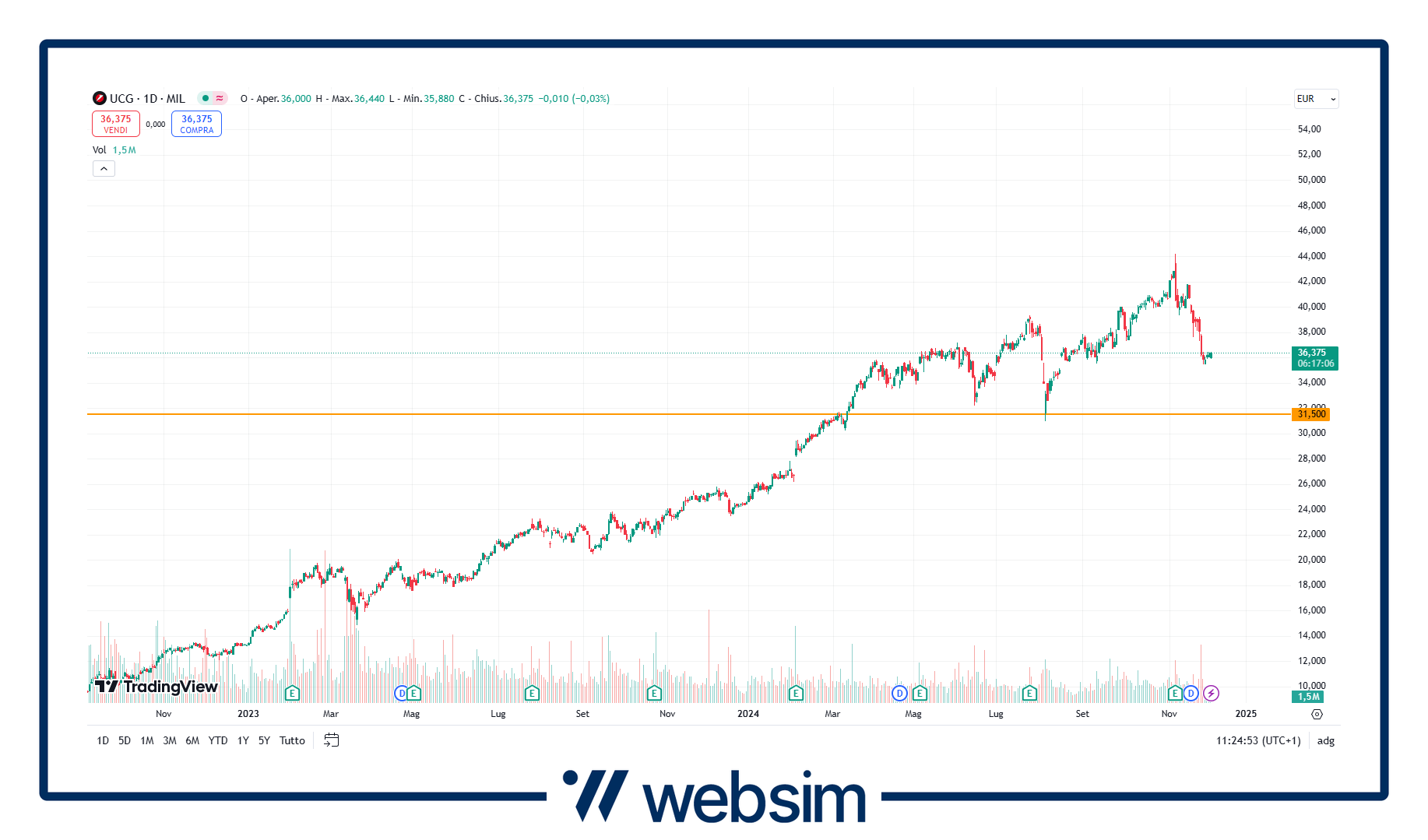 Grande protagonista dell’anno in corso Unicredit è tornata sotto i riflettori nelle ultime settimane dopo la notizia di OPA lanciata verso Banco BPM. L’operazione a detta degli addetti ai lavori avrebbe un forte razionale dal punto di vista industriale, vista la grande complementarità delle strutture. Nonostante ciò, ha detta degli stessi il prezzo iniziale offerto non rispecchia il reale valore dell’operazione, rendendo necessario un sostanziale rialzo della stessa presumibilmente con un contributo cash aggiuntivo. Atteso comunque l’incontro previsto a Parigi tra il CEO di Unicredit Orcel e alcuni tra i maggiori investitori di Banco BPM tra cui il CEO di Credit Agricole. Il titolo scambia attualmente in area 36,40€ , dopo una brillante performance registrata nell’anno in corso del +47,65% circa e sostenuto da un solido supporto posto in area 31,50 €.
