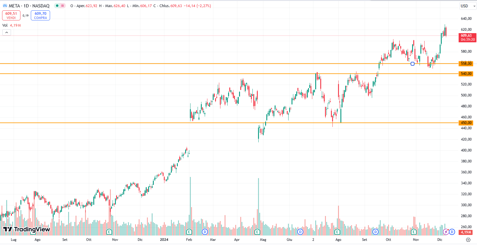 Primo dei tre titoli in analisi è Meta. La scorsa settimana, complice la discesa del rendimento delle Treasury Note a 10 anni (passate da 4,50% a 4,15%), il Nasdaq 100 e le Magnificent 7 sono riusciti a far registrare un rialzo eccellente portando l’indice a mettere a segno i nuovi massimi storici. Tra l’intero pool di nomi particolarmente in luce, e tra i maggiori contributori del picco di performance registrato, è stato senza dubbio Meta, che ha messo a segno un +12% settimanale circa. Meta mette a segno questa ottima performance a conclusione di un anno più che positivo, con una performance sull’anno del +77% circa, attestandosi attualmente a quota 614 usd circa (massimi storici). Il trend è attualmente sostenuto da un primo supporto posto in are 558 usd, successivamente un secondo in area 540 usd ed un ultimo, ultimo checkpoint prima di un importante gap, in area 450 usd.