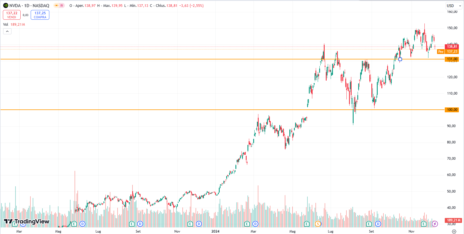 Ultimo titolo del basket è Nvidia, nome ormai più che noto e vero fiore all’occhiello del mercato americano degli ultimi anni. Dopo l’ultima comunicazione dei dati, risultati sopra le aspettative sia in termini di utili che di ricavi, Nvidia consolida sempre più la sua posizione da leader del settore e si candida sempre più a diventare un benchmark per quello che riguarda la nuova rivoluzione tecnologica ormai già iniziata, ovvero quello guidata dall’intelligenza artificiale. Nvidia quota attualmente in area 137 usd, dopo una brillante performance da inizio anno del +181% e attualmente sostenuto da due supporti in area 131 usd e 100 usd.