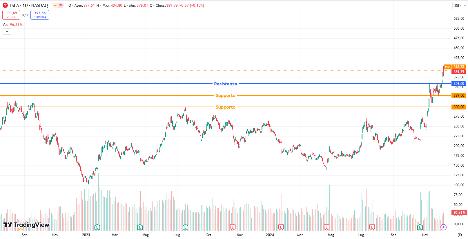 Riprendendo l’exploit fatto registrare dal Nasdaq 100 è doveroso sottolineare come il contributo maggiore al nuovo massimo storico è stato portato da Tesla, che resta ancora sotto la luce dei riflettori come uno dei migliori titoli degli ultimi mesi, facendo registrare su base settimanale un +21% circa. L’exploit della scorsa settimana arriva a conclusione di un anno più che eccellente, dove la stessa Tesla è riuscita a mettere a segno una solida performance del +55% circa da inizio anno, e di un ultimo periodo in cui, complice anche il risultato delle elezioni presidenziali americane, è tornata prepotentemente sotto i riflettori con proiezioni per le possibili vendite future e possibili nuovi business più che rosee. Il titolo attualmente quota in area 390 usd, continuando l’uptrend iniziato da qualche settimana ormai. Possiamo notare infatti la rottura di un ultima resistenza posta in area 359 usd ed il sostegno dato da due supporti in area 329 usd e 300 usd.