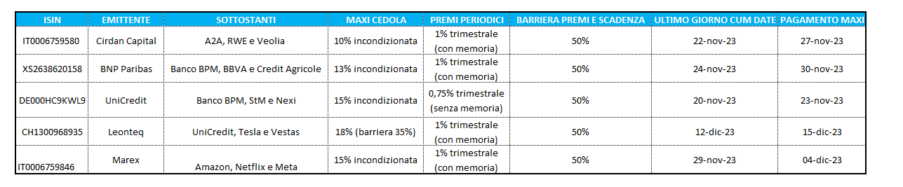 Il Maxi Cash Collect ISIN IT0006759846 di Marex replica il basket worst of composto da Amazon, Netflix e Meta. Il certificato prevede lo stacco di un maxi-premio del 15% incondizionato a fine novembre 2023 (data di pagamento però il 4 dicembre) incondizionato e a partire da aprile 2024 il prodotto staccherà premi trimestrali con memoria del 1% del valore nominale, condizionati ad un livello barriera al 50% dello strike (valida anche a scadenza). Possibilità di scadenza anticipata da ottobre 2024 con effetto step down. Scadenza naturale fissata a ottobre 2026. I titoli del basket sono volatili e dunque il prodotto è adeguato per profili di rischio più alti. Ultimo giorno utile per comprare il prodotto e avere diritto al pagamento del maxi premio è il 29 novembre. Leggi approfondimento qui. Leggi attentamente il KID.