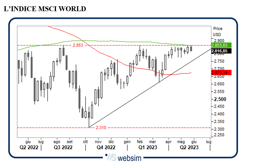 Come previsto con grande precisione dagli analisti di Websim, lo storno sulle Borse mondiali è arrivato al raggiungimento di importanti livelli grafici. Il più significativo riguarda l'indice MSCI World che rappresenta l'andamento dei principali listini del Pianeta che lunedì 22 maggio ha chiuso a 2.845 punti, sui massimi da agosto 2022, in corrispondenza di una fortissima resistenza. “A meno di novità positive sensazionali, difficilmente quest'area potrà essere violata senza prima una fase di fisiologico assestamento”, aveva scritto tre giorni fa Mauro Vicini, responsabile dell’Ufficio studi e co-fondatore di Websim.