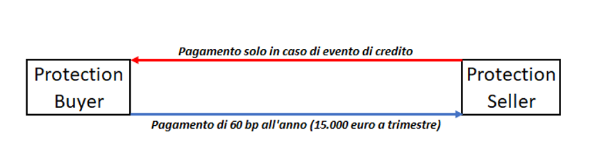 Immaginiamo che due investitori entrino in un CDS a cinque anni. Il compratore detiene 10 milioni di euro di un’obbligazione corporate e decide di assicurarsi sul rischio di credito tramite un CDS. Pagherà dunque al venditore del CDS un premio che sarà funzione del rischio di credito dell’emittente dell’obbligazione. Ipotizziamo questo premio sia di 60 punti base. Le opzioni sono due. Se l’evento di credito non si verifica, il venditore avrà incassato 15.000 euro (0,006/4*10.000.000) al trimestre per cinque anni, ovvero 300.000 euro. Un bell’affare per il venditore. Un costo per il compratore, proprio come quando assicuriamo la macchina.