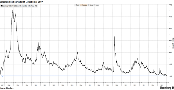Analizzando l’indice Bloomberg denominato Global Credit Corporate Statistics Index Value USD, non si può fare a meno di notare come gli spread dei bond corporate abbiano toccato i minimi dal 2007 (Vedi Figura 1).