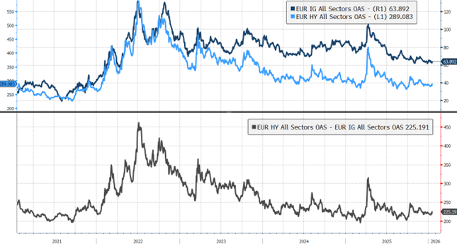 Nel 2025, l’attenzione degli investitori è stata indirizzata verso le ottime performance delle Borse, con nuovi massimi raggiunti da diversi listini azionari, tra cui S&P 500, Euro Stoxx 600 e Nikkei 225, così come da alcune commodity, quali oro e argento. Tuttavia, il positivo momento sui mercati degli ultimi mesi è osservabile anche nel mondo obbligazionario.