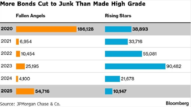 Figura 5: Numero di aziende “Fallen Angels” (società il cui rating è stato declassato da Investment Grade a High Yield) e “Rising Stars” (società che hanno compiuto il percorso inverso) dal 2020 al 2025.