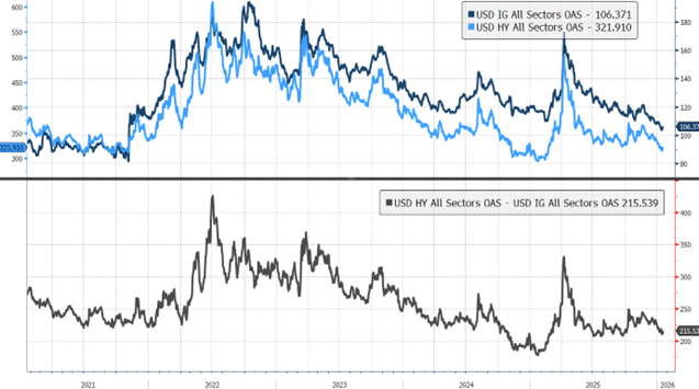 L’indice comprende bond denominati in diverse valute e con differenti rating. Se lo scomponiamo in indicatori più focalizzati sui singoli comparti, emerge come questo trend si stia diffondendo trasversalmente. Il positivo andamento dei bond corporate è infatti riscontrabile sia nel segmento Investment Grade sia in quello High Yield, e in entrambe le principali aree geografiche, statunitense ed europea. Questo restringimento degli spread corporate sta andando avanti dal 2022 (Vedi Figura 1, 2 e 3), fatta eccezione per alcuni momenti di tensione, come i mesi della prima imposizione dei dazi da parte di Trump, il cosiddetto “Liberation Day”.