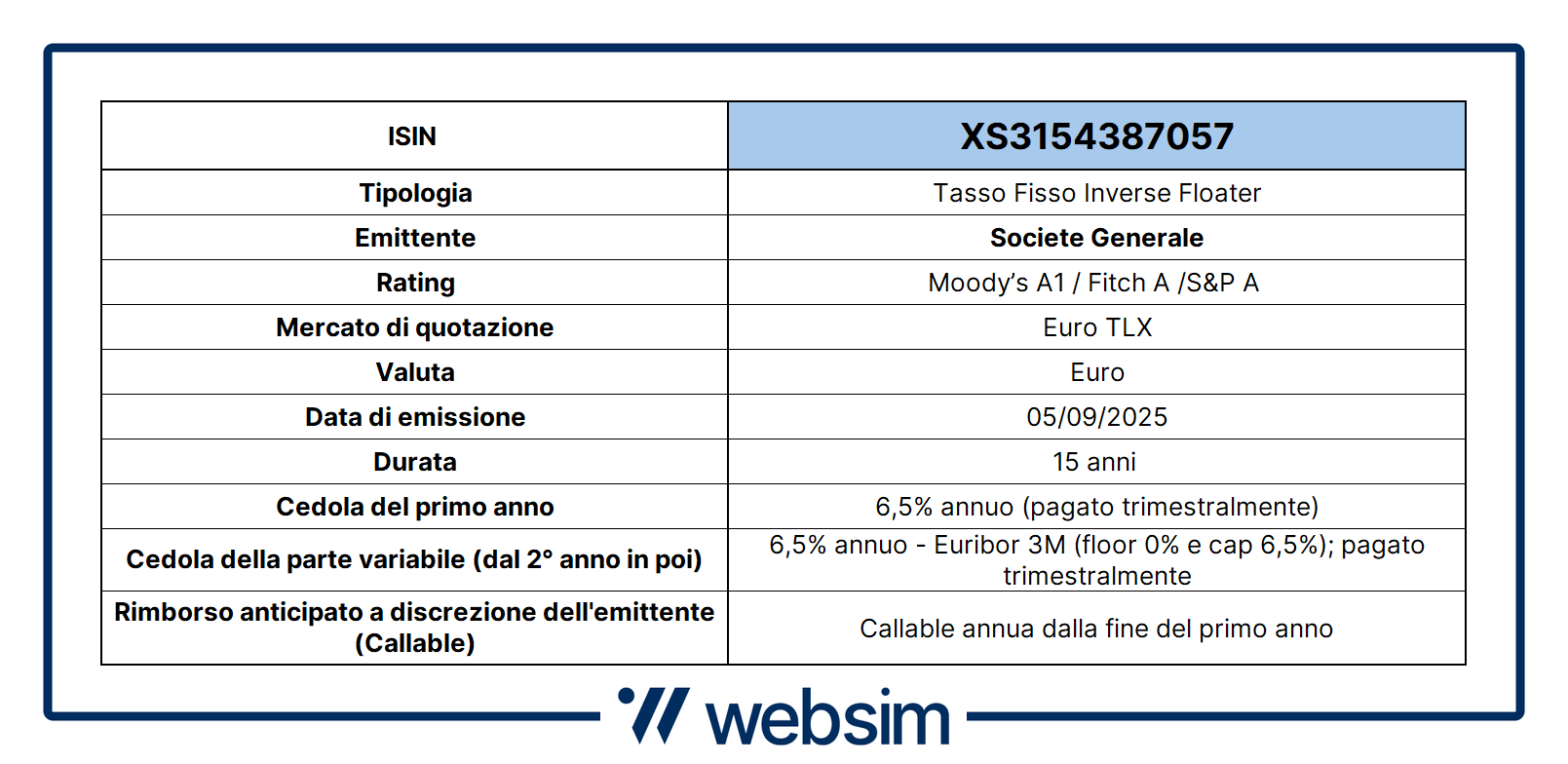L'obbligazione in euro con codice ISIN XS3154387057 è stata emessa da Societe Generale e ideata da Intermonte. Si tratta di un Fix to Inverse Floater, una struttura apprezzata dal mercato e che nasce come risposta a due esigenze: premiare subito l’investitore con una cedola fissa generosa, in questo caso del 6,5% annuo lordo al primo anno. In seguito, e fino a scadenza si attiva la parte variabile che ha l'obiettivo di proteggere e di legare il rendimento all’andamento dell'Euribor 3 mesi ma in forma inversa (6,5% - Euribor tre mesi con floor allo 0% e un cap al 6,5%). Tutte le cedole sono pagate trimestralmente.
