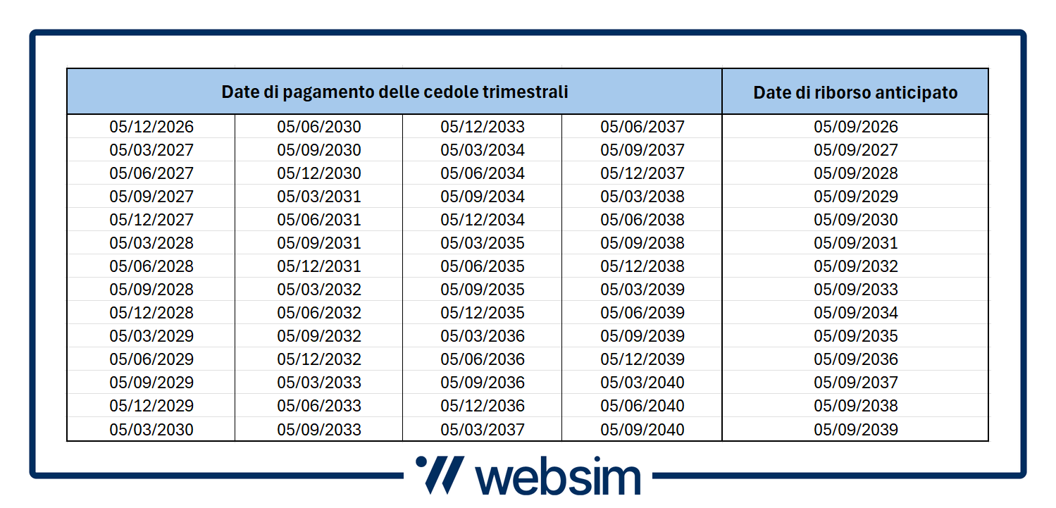 La struttura prevede la possibilità di rimborso anticipato annuo a discrezione dell'emittente (Callable), a partire dalla fine del primo anno di vita (settembre 2026). A scadenza (settembre 2040) o in caso di richiamo, il bond rimborsa il 100% del valore nominale, più l’ultima cedola dovuta.