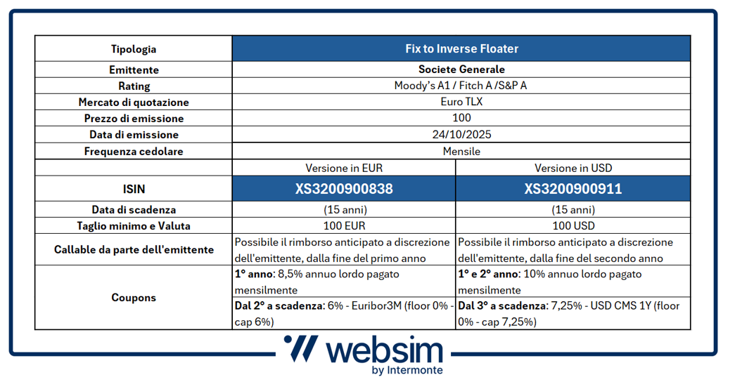 Da Societe Generale due bond in euro e dollari che pagano prima a tasso fisso, poi variabile inverse floater, con cedole mensili. In dollari paga due cedole del 10%. In euro, paga un anno l’8,5%.