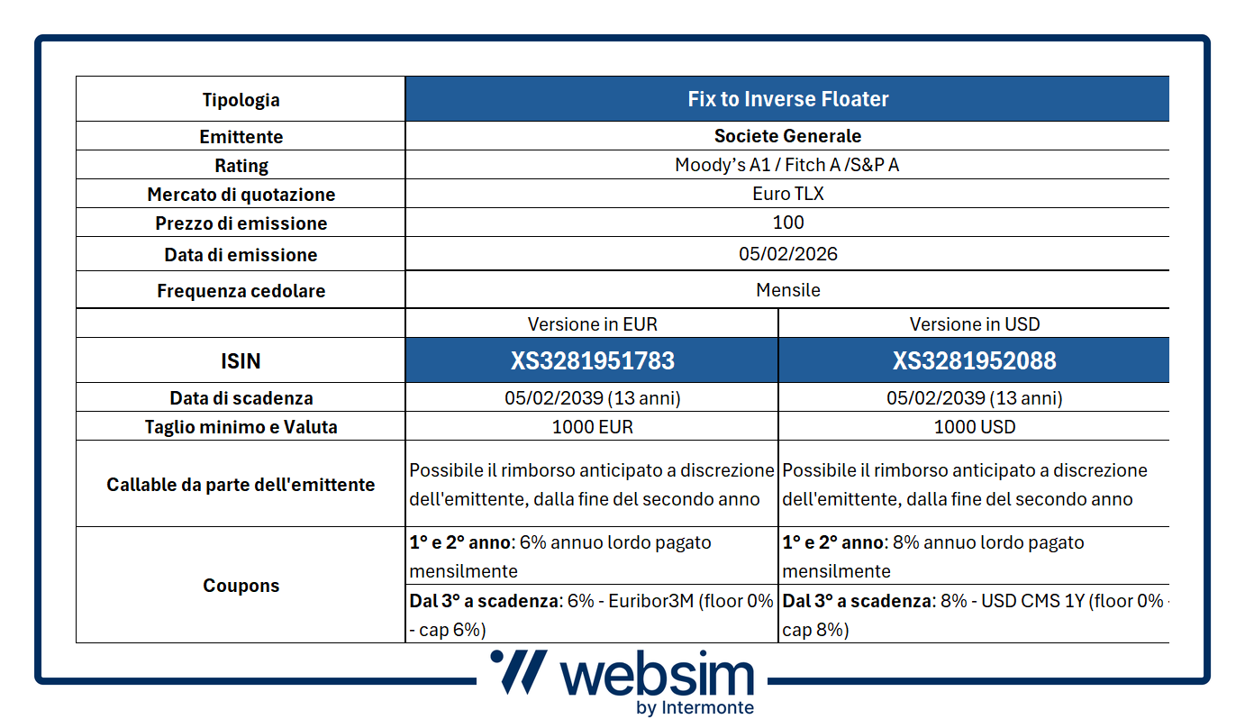 Da Societe Generale due bond in euro e dollari che pagano due anni a tasso fisso, poi variabile reverse floater, tutto con cedole mensili. In dollari paga due cedole fisse del 8%, in euro del 6%.