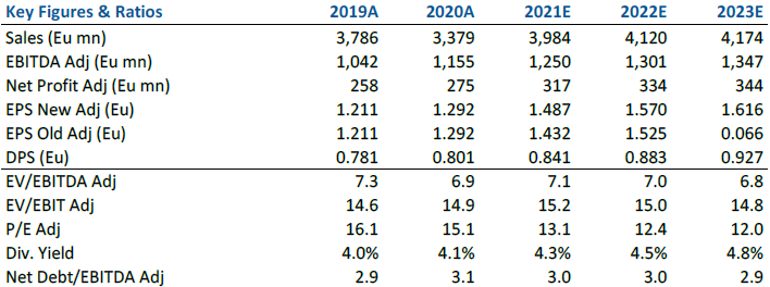 Abbiamo rivisto leggermente al rialzo le stime (EPS 2021/2022 +3,4% in media) e il target price (a 20,5 euro da precedente 19,5 euro) e confermiamo la raccomandazione neutrale.