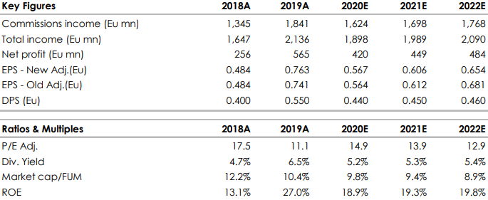 Dopo il crollo della borsa dovuto agli effetti dell'epidemia da coronavirus, il titolo è arrivato su valutazioni secondo noi molto attraenti, data anche la struttura snella della società e le dinamiche della raccolta (molti piani di accumulo) che non subiscono forti impatti dal rallentamento dell'attività economica. Andranno probabilmente riviste al ribasso le previsioni di performance fee sul primo trimestre.