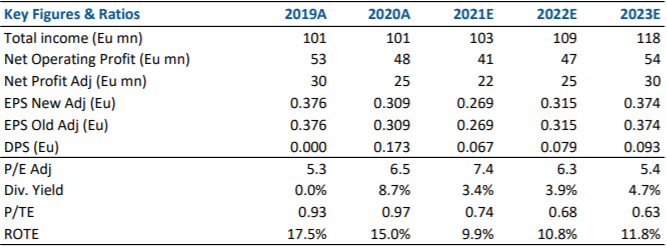 L'utile netto è visto raggiungere 7 milioni di euro nel quarto trimestre e 22 milioni nel 2021, con un CET1 ratio fully loaded dell'11,7%.