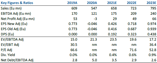 I numeri di fatturato del secondo trimestre hanno mostrato una forte accelerazione rispetto al primo (confrontando i numeri rispetto agli omologhi periodi nel 2019). I numeri completi del semestre saranno pubblicati il prossimo 26 agosto. Allineiamo le nostre stime alle indicazioni del management che vede una crescita dei ricavi pari al 20%.