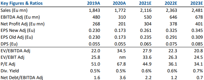 L'EBIT rettificato si attesta a 223 milioni (variazione organica +88,7%, il che implica una marginalità al 22,3%, in crescita di oltre 500 punti base sul pari periodo 2020), sopra le attese del 23,2%.