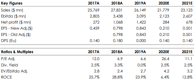 Il management non ha fornito indicazioni sul 2020, evidenziando tuttavia che il calo del fatturato nel secondo trimestre sarà superiore a quello del primo (-14% escluso il forex) con un assorbimento di cassa simile a quello registrato nel primo trimestre e pari a 1,5 miliardi.