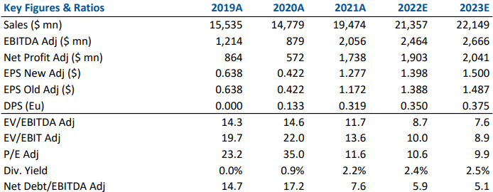 CNHI prevede ricavi industriali in crescita del +10% a +14% YoY nel 2022, con un miglioramento delle condizioni della supply chain atteso nel secondo semestre 2022. FCF industriale previsto superiore a 1 mld (nostra stima 1.2 mld).