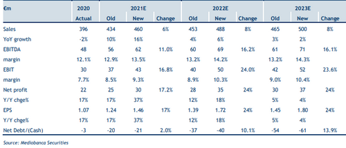 Rispetto al prezzo attuale, il giudizio obiettivo presenta un potenziale rialzo del +14% circa. Gli analisti di Piazzetta Cuccia hanno aumentato le stime sul 2021 e sul 2022, per includere l’accelerazione delle vendite e dei margini delle divisioni AG e Construction, e l’incremento della guidance da parte dei principali operatori del settore. In dettaglio, le previsioni di Mediobanca su Comer per il 2021, riguardo alle vendite, Ebitda e profitti netti, sono aumentate rispettivamente del +6%, +11% e 17%