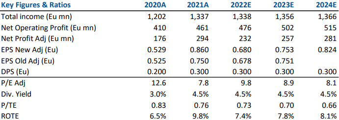 Si tratta di un set di dati positivi. Apprezziamo in particolare l'incremento del dividendo del tutto inatteso dal consenso degli analisti. Guardando alla remunerazione degli azionisti, la banca propone un dividendo per azione pari a 0.30 euro (+50% YoY), equivalente ad un dividend yield del 5% circa. Credem, inoltre, conferma l’ottima solidità patrimoniale con un CET1 ratio pari al 13.7%, equivalente ad un MDA buffer pari a circa 615 punti base. Il 2021 è stato un anno eccezionale per Credem che ha beneficiato a livello operativo della sua propensione al business commissionale e assicurativo e a livello finanziario dal badwill derivante dall’acquisizione di CrCento.
