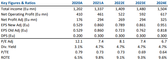 Abbiamo rivisto al rialzo in modo significativo le nostre stime di EPS (+9%/+13%/+16% nel 2022/2023/2024) principalmente per via della capacità della banca di riprezzare in maniera rapida il proprio portafoglio impieghi.