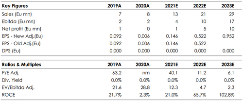 L'Ebitda è diminuito del -53% su base annua a 0,67 milioni, con un margine del 24% (rispetto alle nostre stime di 0,74 milioni/25%), a causa di un amento degli investimenti in personale e consulting.