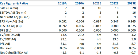 Abbiamo limato le nostre stime sui ricavi del -7% circa per il 2021, per via del maggiore assorbimento dei costi fissi (principalmente costi del personale) già osservati nel primo semestre.