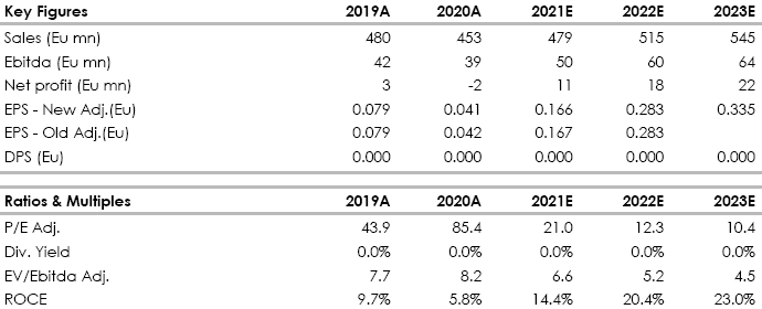 Le stime di consensus del 2021 sembrano facilmente raggiungibili (vendite pari a 470-480 milioni di euro, Ebitda rettificato pari a 50 milioni di euro, Ebit rettificato a 25 milioni di euro con un margine del 5,5%, investimenti pari a 20 milioni).