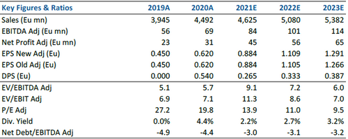 Abbiamo lasciato invariate le nostre stime di utile per azione e limato quelle sui ricavi 2021-22 per includere le difficoltà sulla catena di approvvigionamento nella prima parte del 2022. Abbiamo rinforzato le stime sui margini, per considerare la nuova strategia di massimizzazione del Roce. Le nuove previsioni sono allineate con i target di piano.