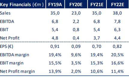 Nello studio si legge che “I valori comunicati dalla Società risultano in netto miglioramento rispetto alle nostreprecedenti stime in termini di: Ricavi (26 milioni rispetto il 23 milioni), EBITDA (3,95 milioni rispetto ai 2,2 milioni), EBIT (2,34 rispetto alla cifra di 0,80 milioni), Net Income (1,65 milioni rispetto ai 0,45 milioni) e PFN (2,42 rispetto ai 4,53 milioni).