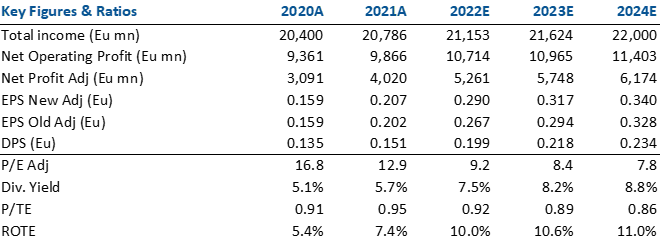 In particolare, Itesa ha chiuso il quarto trimestre 2021 con un utile netto di 179 mln (vs 7 mln nelle nostre stime) evidenziando un positivo andamento delle commissioni. Costo del rischio in linea con le attese. Riteniamo che i target operativi presentati nel Piano siano superiori alle nostre stime e a quelle di consensus, l’utile netto 2025 a 6.5 mld implica probabilmente un tax rate più alto delle nostre stime.